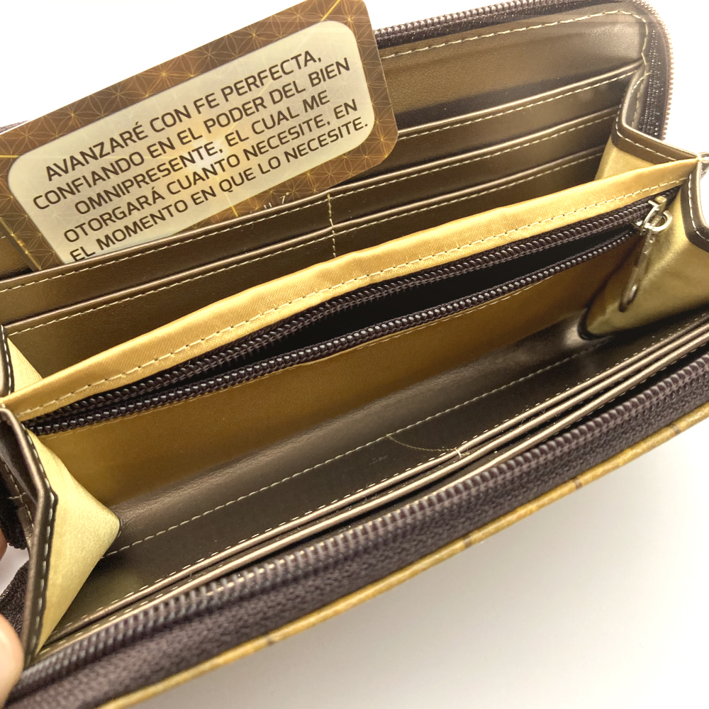 Amo mi cartera de abundancia con gama de colores dorado y cobre! Yo soy abundancia! El espacio para guardar esta muy cómodo, tanto para acomodar tarjetas, guardar billetes y monedas con una bolsa de cierre interior. La calidad del material esta excelente! Adicional le puse 1 raja de canela, 1 hoja de laurel y un billete de 1 dólar, y una moneda dorada de 10 pesos. Y mi tarjeta celestial! Namaste!