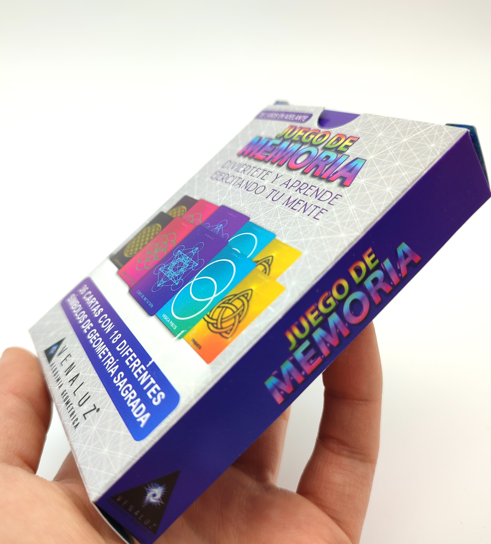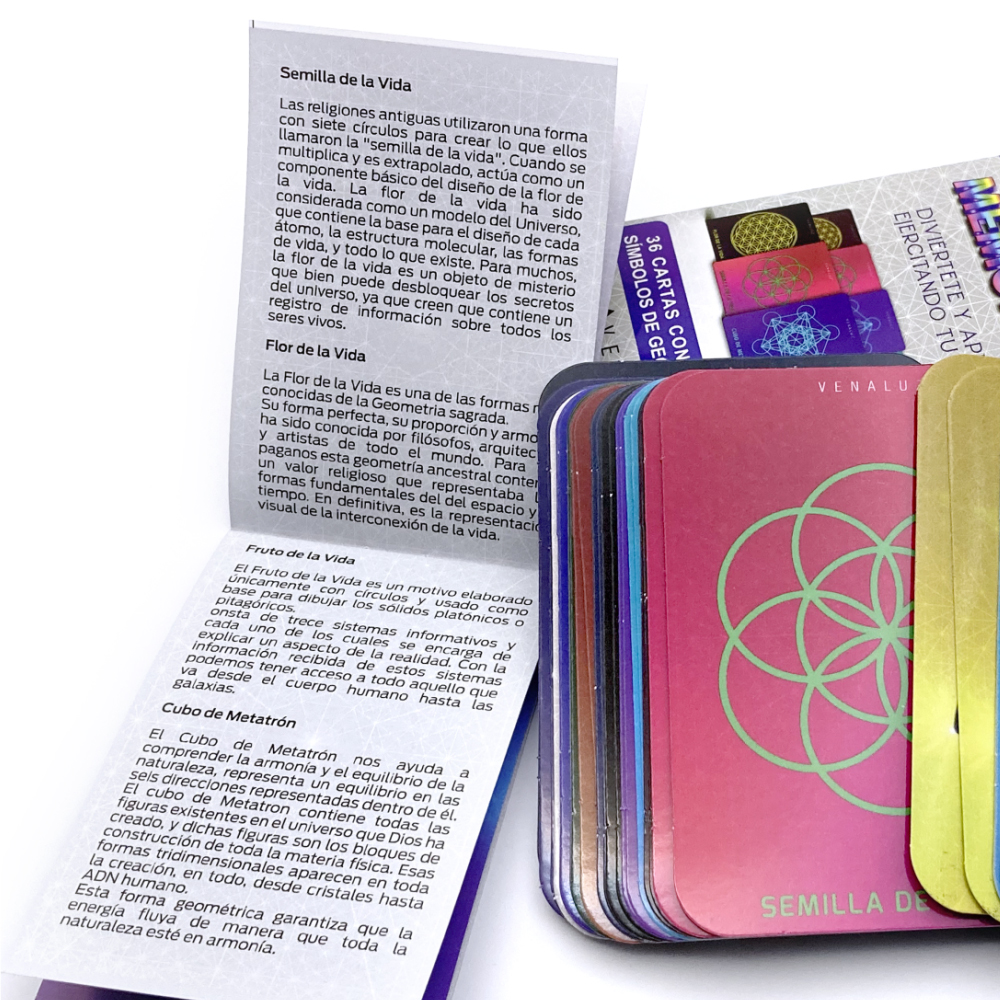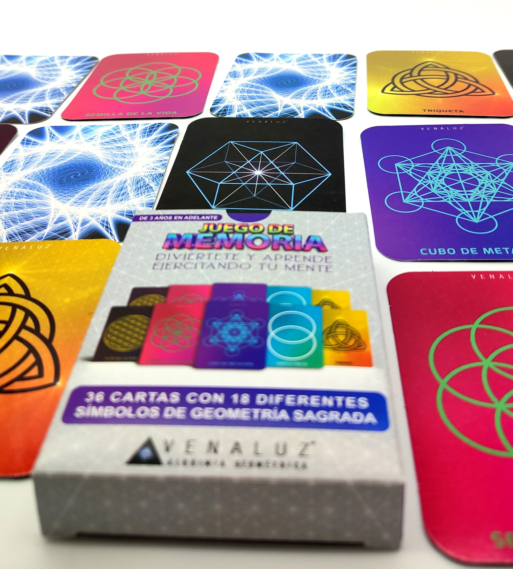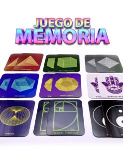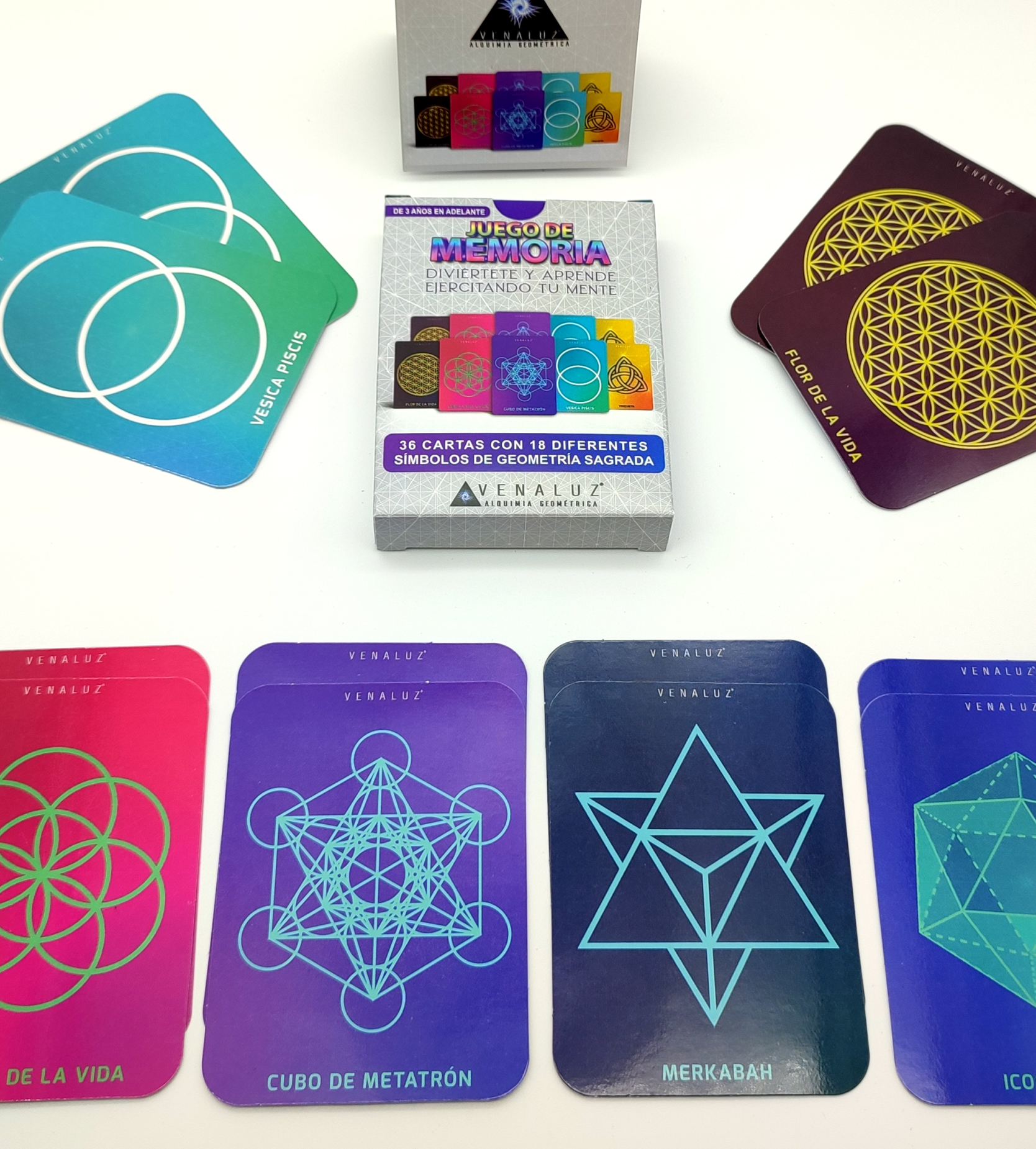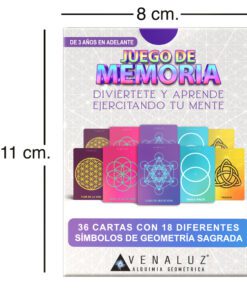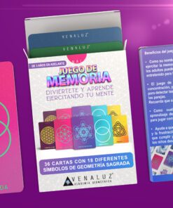 Diviértete y aprende ejercitando tu mente. Caja que contiene 36 cartas con 18 diferentes símbolos de geometría sagrada y un instructivo y breve información de cada símbolo. Beneficios del Juego de Memoria Venaluz