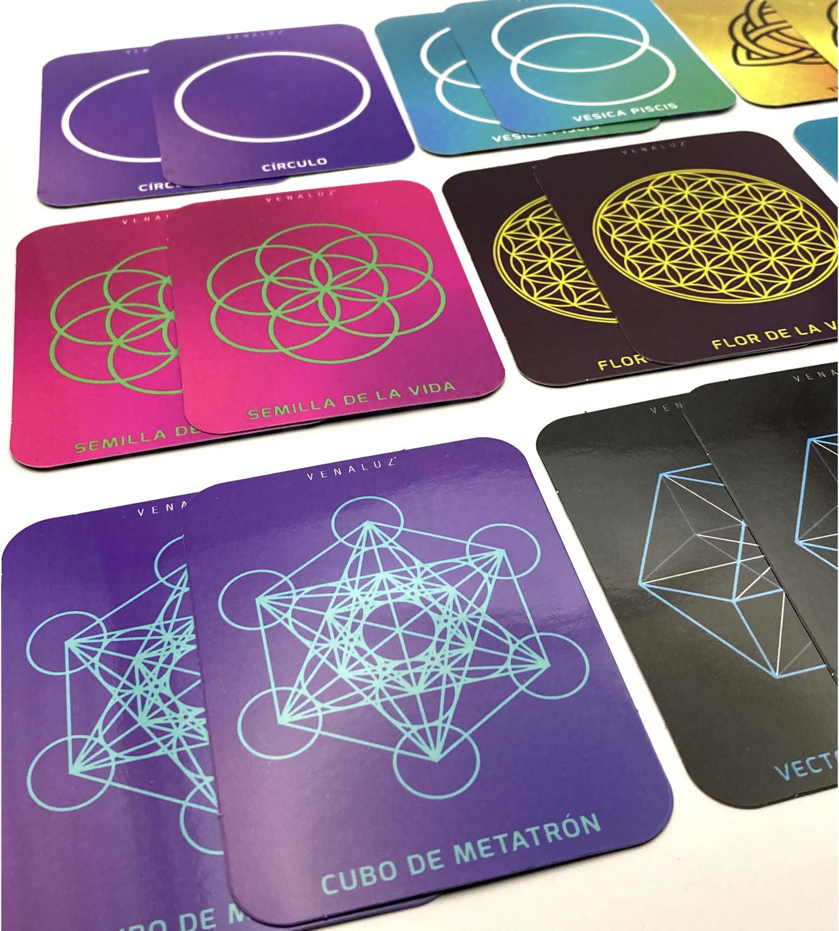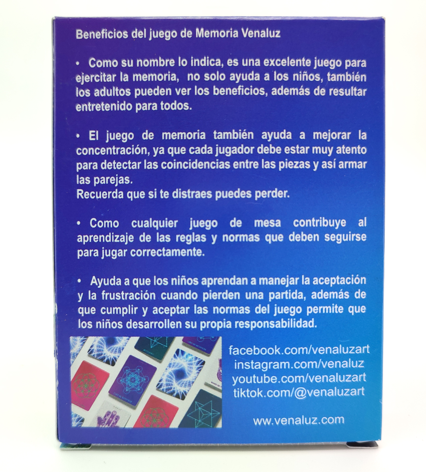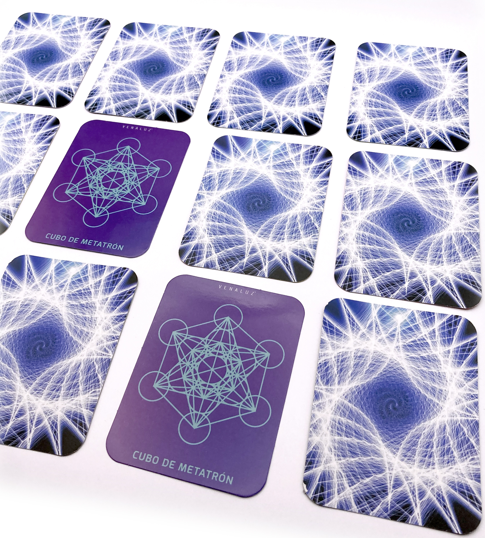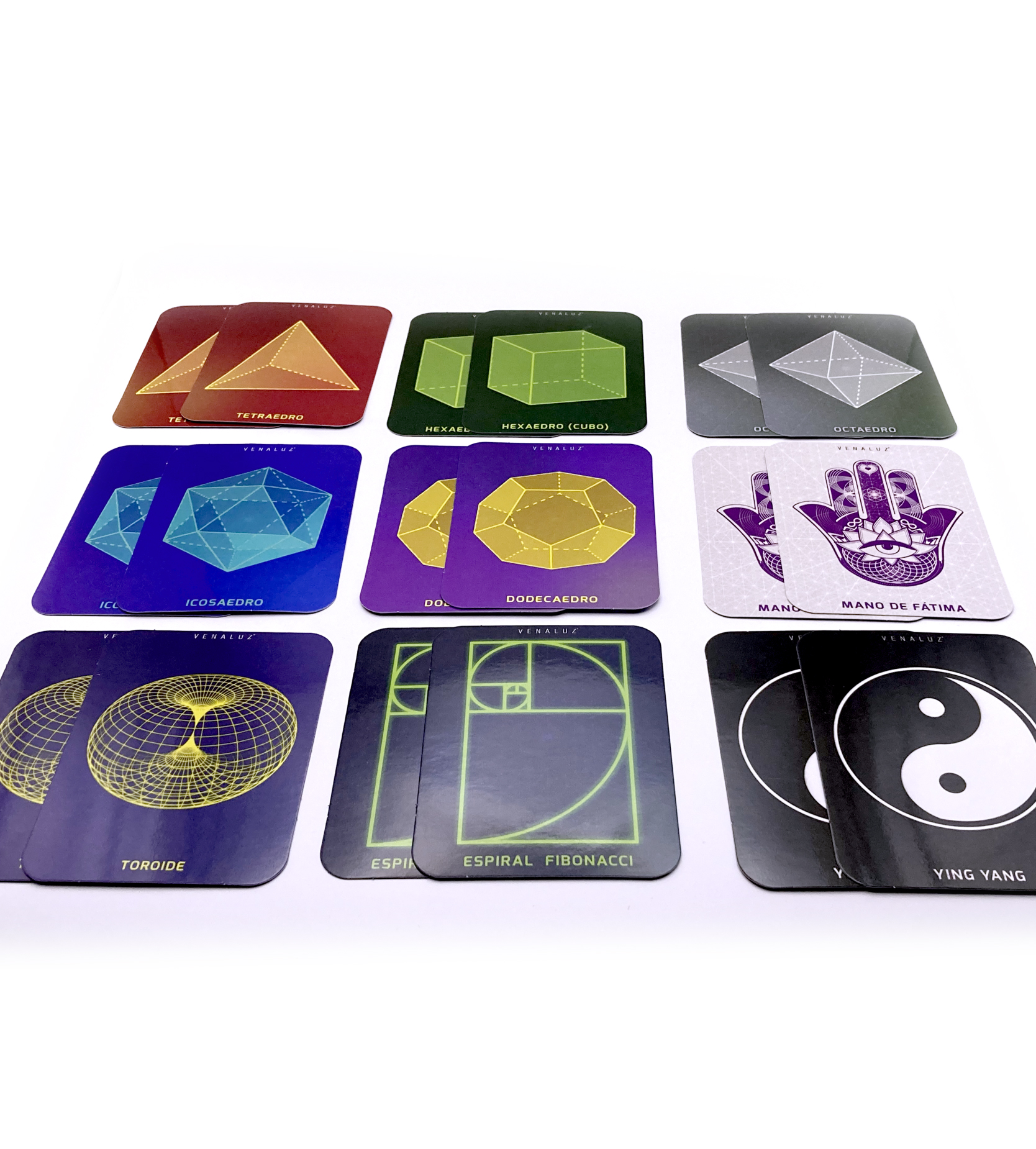 Diviértete y aprende ejercitando tu mente. Caja que contiene 36 cartas con 18 diferentes símbolos de geometría sagrada y un instructivo y breve información de cada símbolo. Beneficios del Juego de Memoria Venaluz